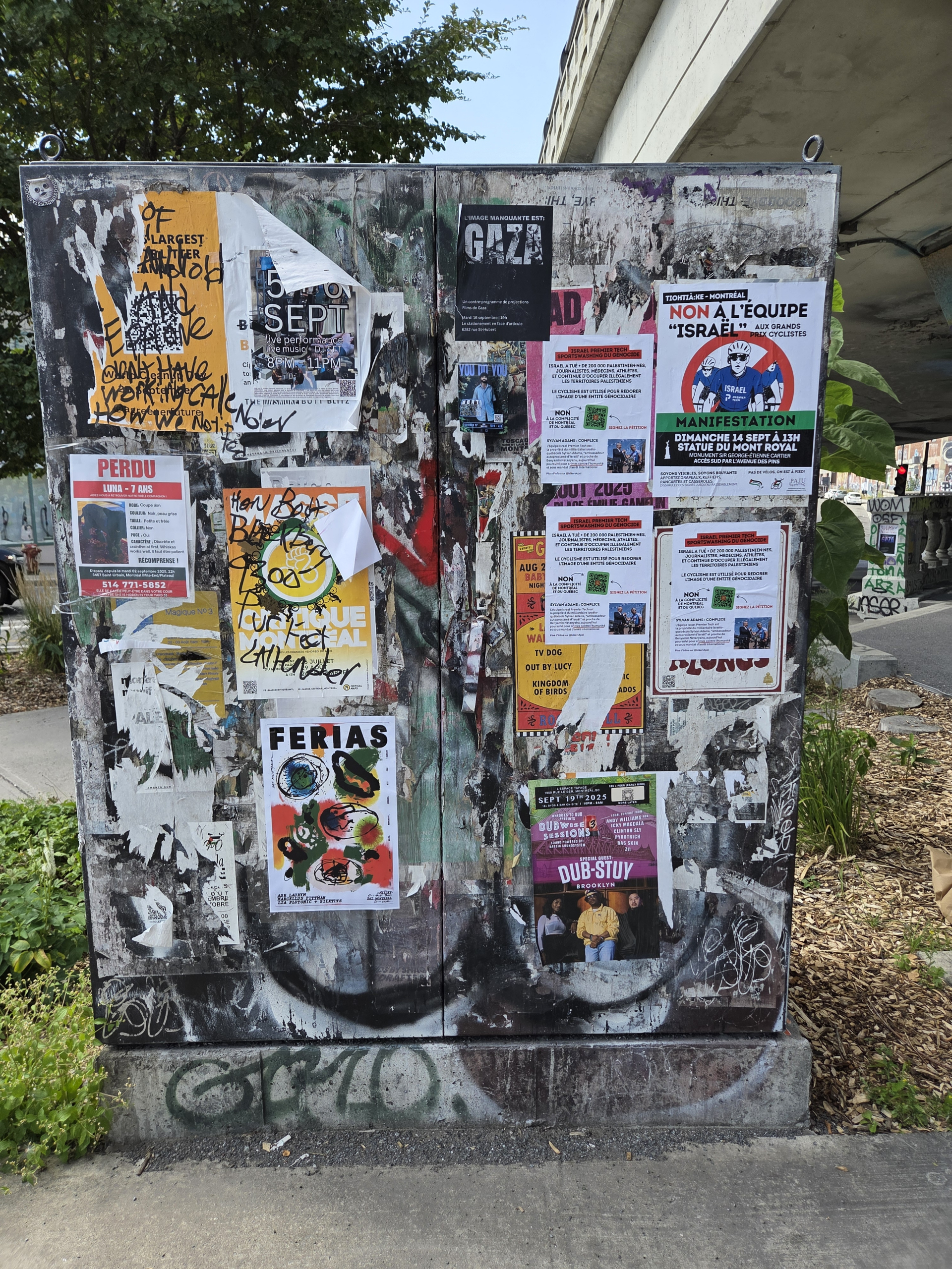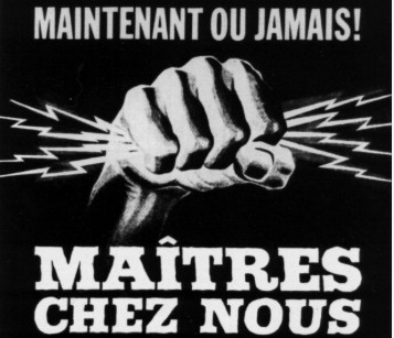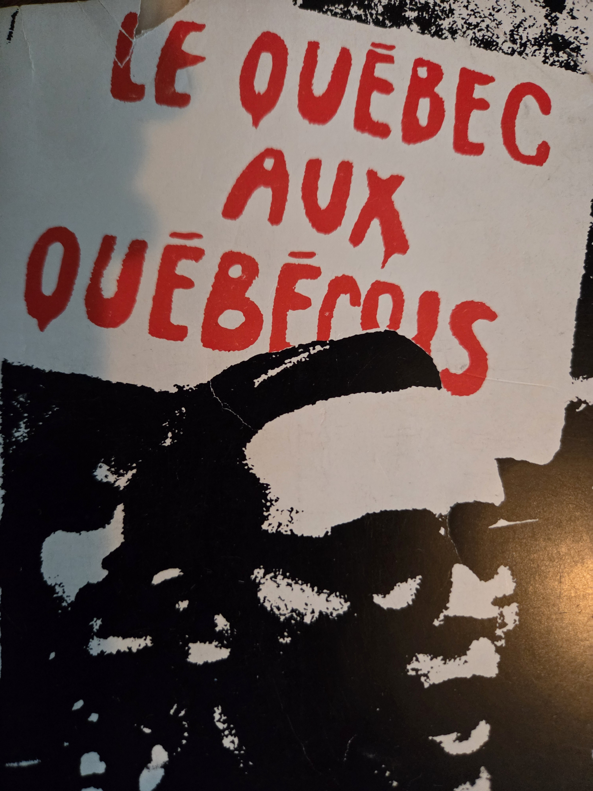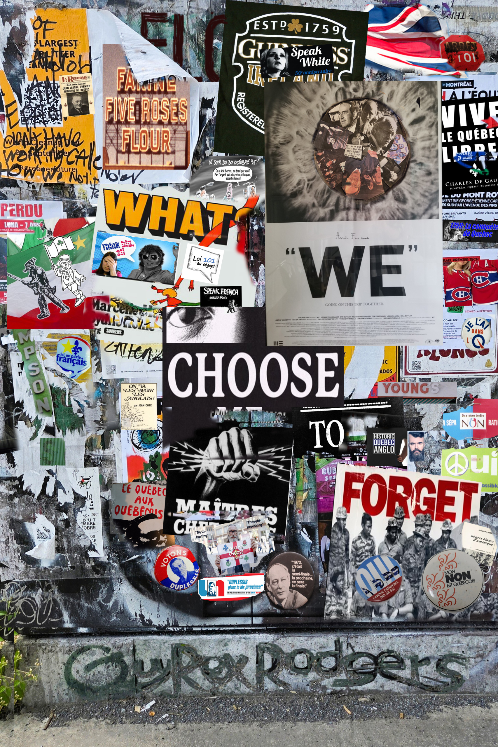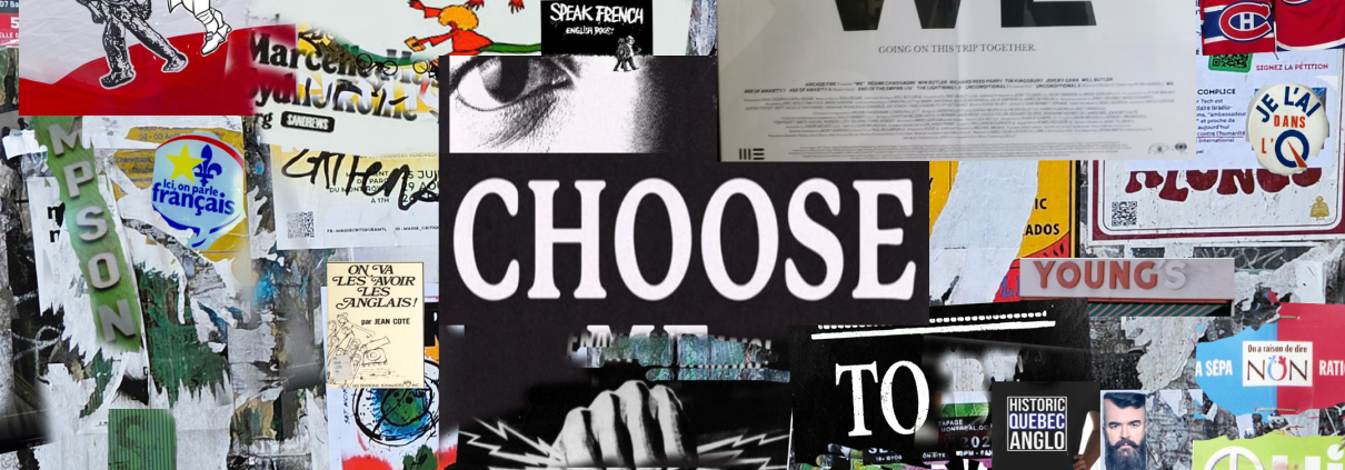 GRR: The concept was clear, but I knew it entailed a lot of work for which I had no budget. I decided to collect all the materials I had in mind and to make a mock-up so that a graphic artist could turn them into a cover image fairly quickly. I spent last summer walking the streets of Montreal shooting photos of billboards and posters. I finally found the perfect background image in the skatepark on Saint Laurent beneath the Van Horne overpass. In parallel, I collected images of Quebec’s political and linguistic history.